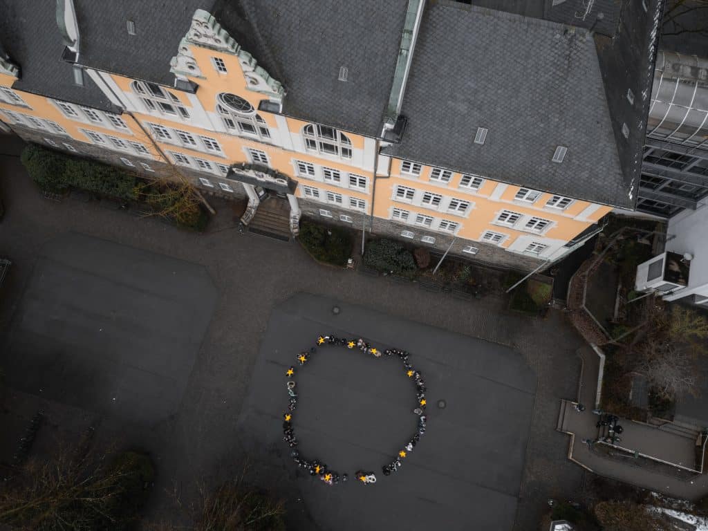 Foto: Auf dem Schulhof entstand am Demokratietag ein 12-Sterne-Bild, bei dem die Sechstklässler in Anlehnung an die Europaflagge Solidarität und Verbundenheit demonstrierten.