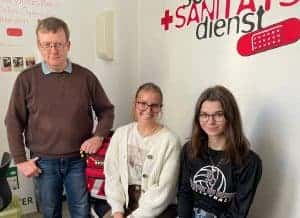 Das Orga-Team des Schulsanitätsdiensts stellt sich vor: Dr. Thielmann, Teresa Hössl (Q1) und Charlotte Klock (Q1)