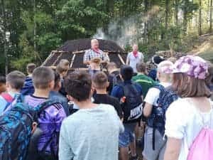 Janik Klement, der Poskevater der Waterpoorte, sowie die anwesenden Poskebrüder erzählten den Gymnasiasten einiges über das historische Handwerk des Köhlers.
