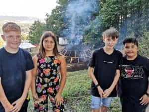 Foto: Jaron, Elena, Leon und Tan vor dem frisch entzündeten Kohlemeiler.