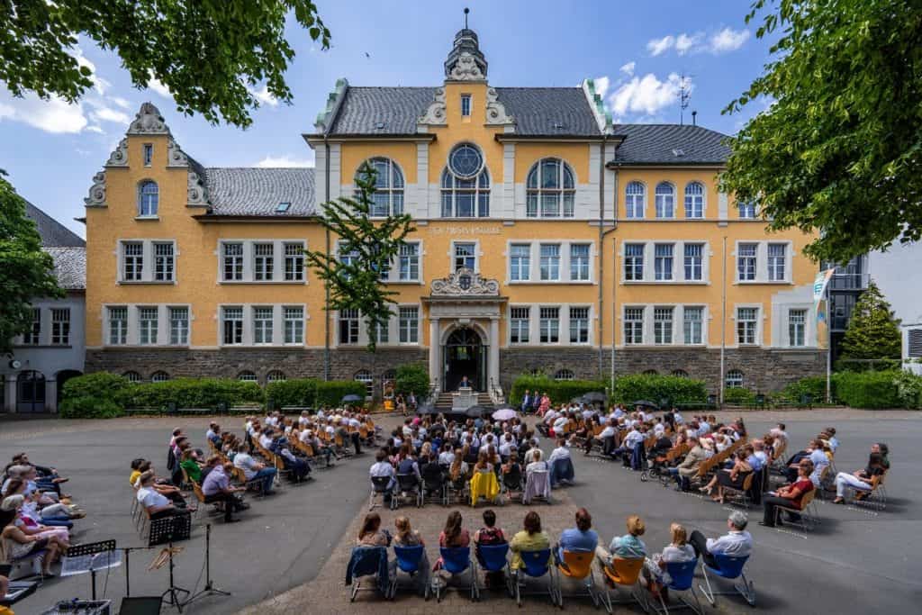 Am frühen Nachmittag folgte die Zeugnisausgabe, die auf Wunsch des Abiturjahrgangs auf dem Schulhof im Herzen der Stadt stattfand.