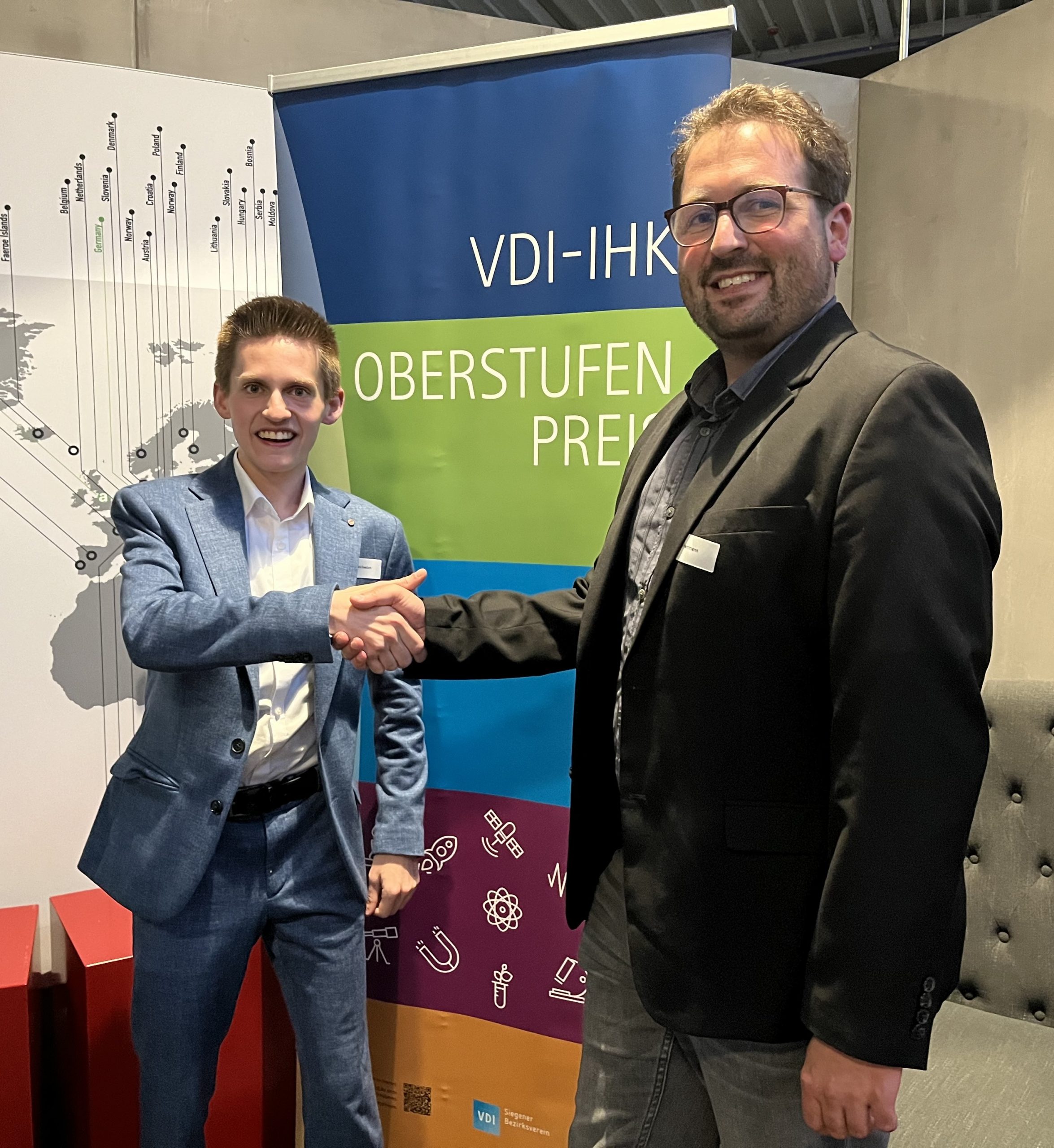Foto: Chemielehrer Nils Herrmann gratuliert Frederik Kieslich (links) zum VDI-IHK-Preis