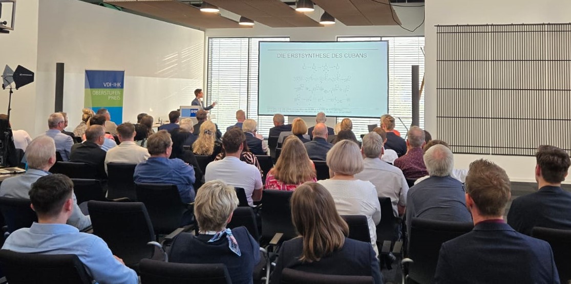 Den ersten Platz sicherte sich Frederik Kieslich, Abiturient des Rivius Gymnasiums Attendorn. Seine Facharbeit mit dem Titel „Optimierung der Synthesen von polycyclischen, gesättigten und platonischen Kohlenwasserstoffen, genauer Käfigverbindungen, am Beispiel einer Synthesestufe des Moleküls Cuban und anschließender analytischer Auswertung“