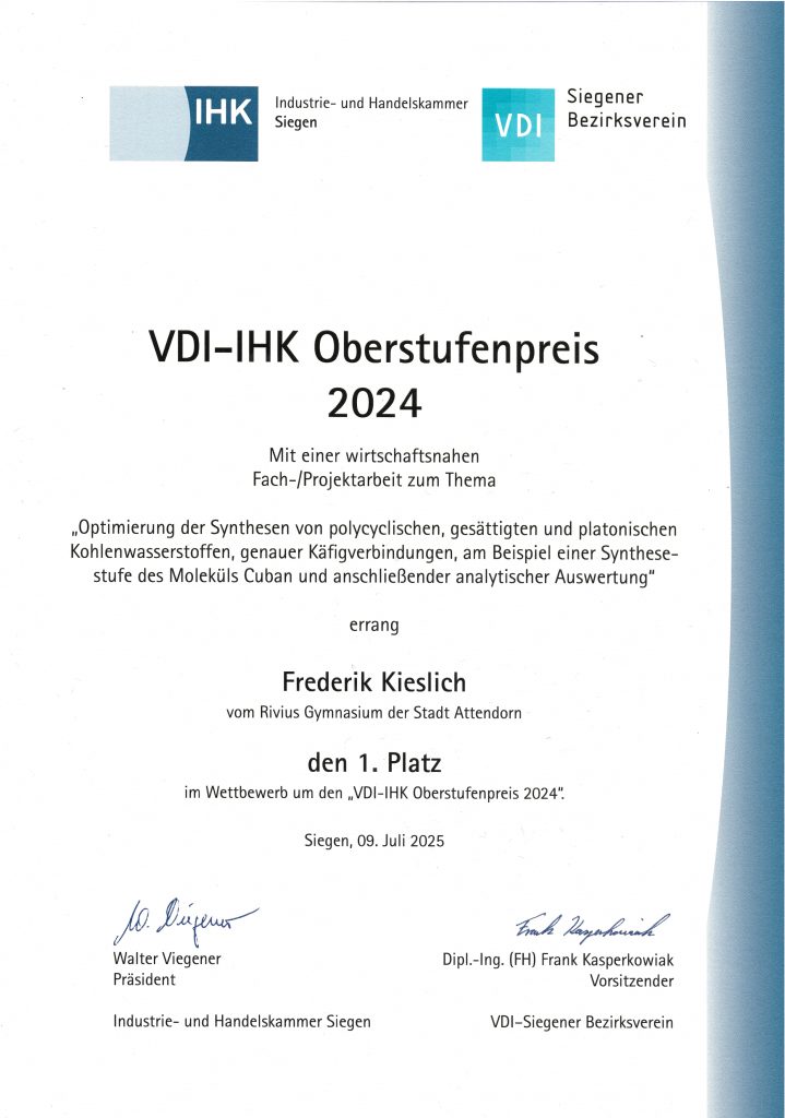 Den ersten Platz sicherte sich Frederik Kieslich, Abiturient des Rivius Gymnasiums Attendorn. Seine Facharbeit mit dem Titel „Optimierung der Synthesen von polycyclischen, gesättigten und platonischen Kohlenwasserstoffen, genauer Käfigverbindungen, am Beispiel einer Synthesestufe des Moleküls Cuban und anschließender analytischer Auswertung“