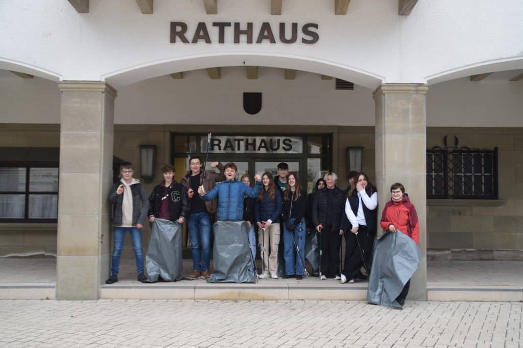 Startpunkt war nämlich das Rathaus, wo die Schülerinnen und Schüler mit Müllsäcken und Greifzangen versorgt wurden. Dank der Koordination von Sabine Heim waren die Müllsammlerinnen und Müllsammler im Stadtgebiet gemeinsam mit den Lehrkräften Michelle Bottländer, Nils Herrmann, Dr. Maria Reuber und Dr. Georg Thielmann unterwegs.