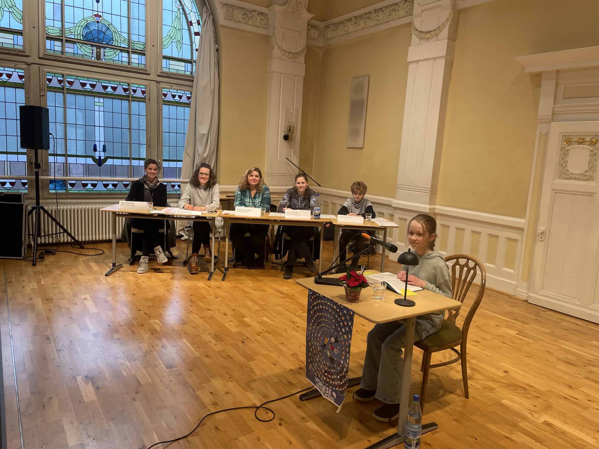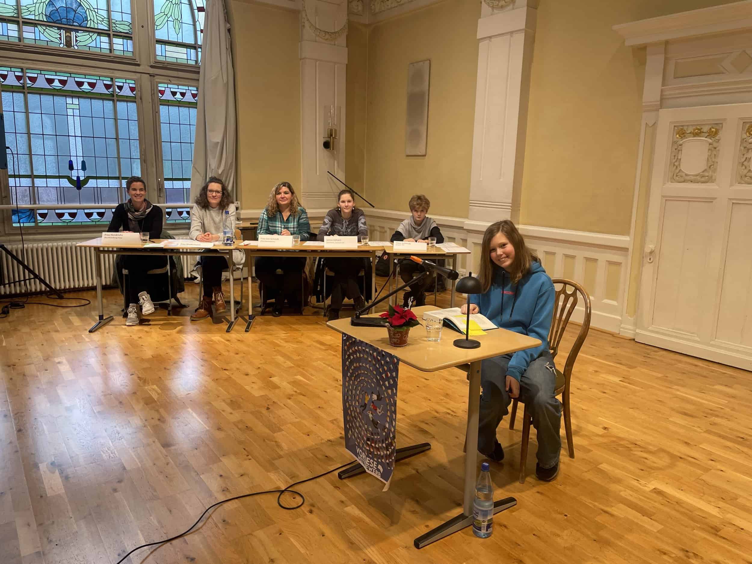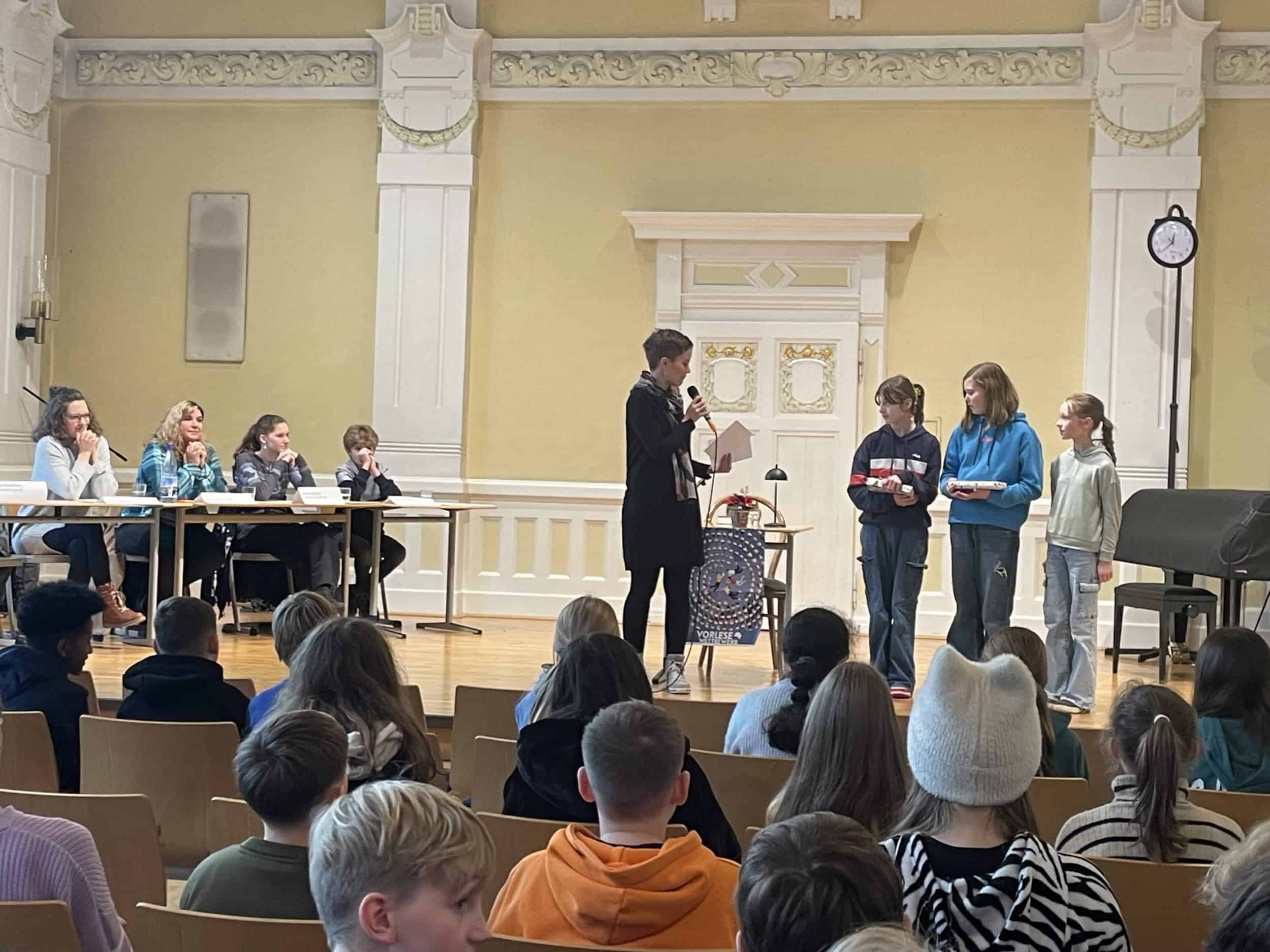 Bei der Suche nach einer Antwort stellte sich heraus, die Schülerinnen und Schüler der Klassen 6 lesen gerne, viel und gut. In einem Kopf-an-Kopf-Rennen ermittelten die Klassen im Deutschunterricht zuerst jeweils drei Klassensieger. Zwischen ihnen fand der Schulentscheid in der Aula statt.
