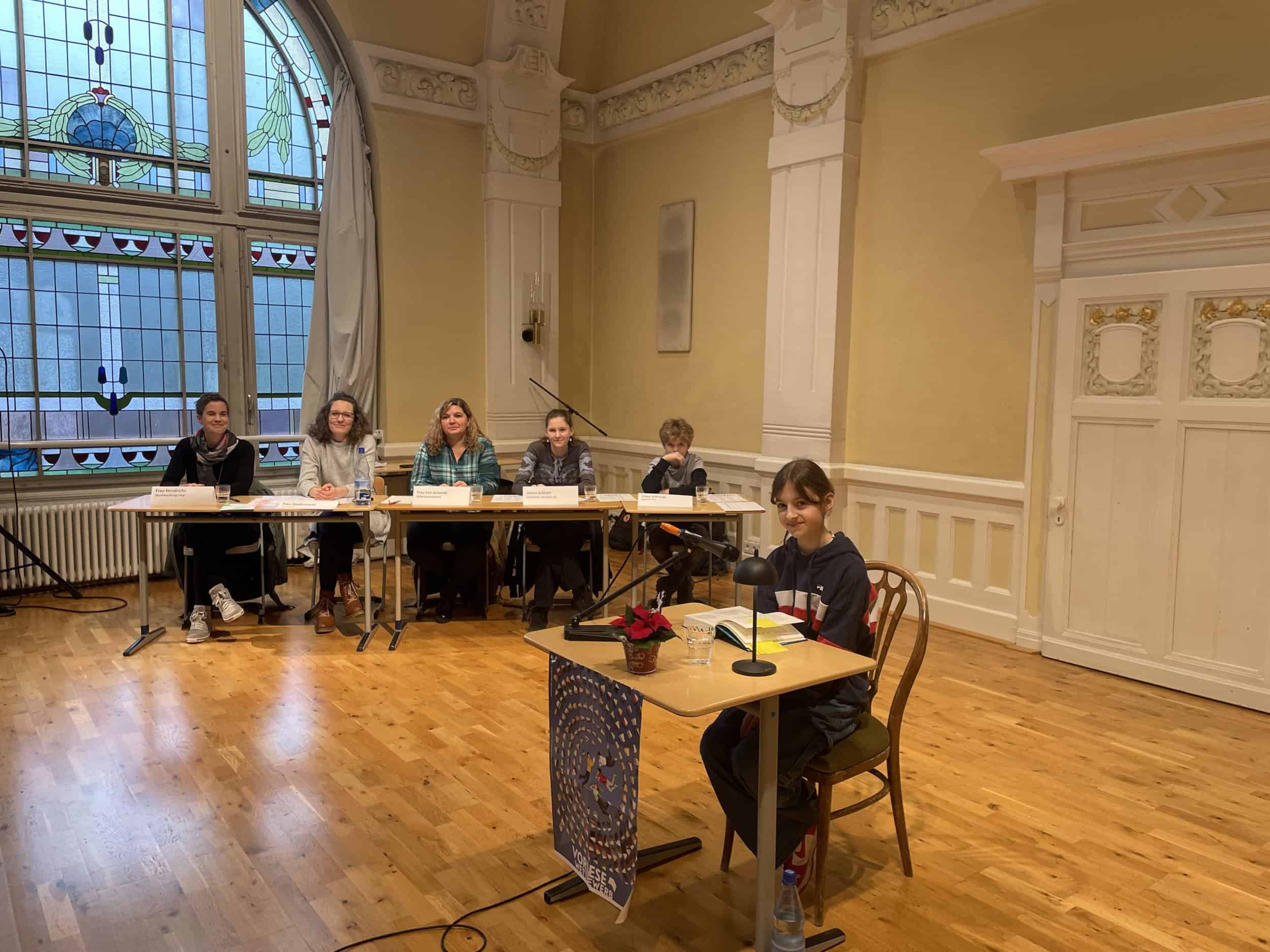 hintere Reihe von links: Timo Schmidt (Vorjahressieger aus der 7b), Janna Götzen (Leistungskurs Deutsch), Marike Stadermann (Deutschlehrerin), Fatima Can-Schmidt (Elternvertreterin), Sonja Hendrichs (Buchhändlerin aus der Buchhandlung Frey)