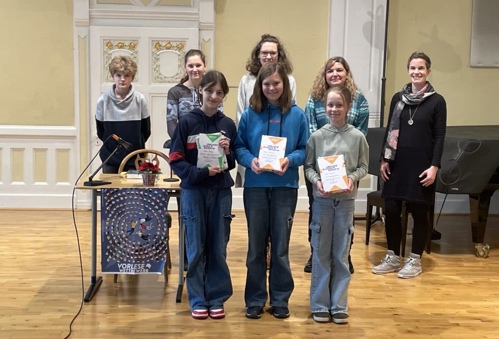 Foto: Die Klassensiegerinnen des Vorlesewettbewerbs gemeinsam mit der Jury.