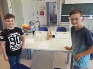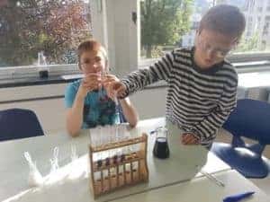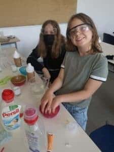 Angeleitet von Fünftklässlern des Rivius Gymnasiums konnten die Drittklässler in kleinen Gruppen spannende Experimente ausprobieren und dabei in den naturwissenschaftlichen Unterricht am Gymnasium reinschnuppern. Viel Freude bereiteten vor allem das Färben kleiner Stoffbeutel mit roter Beete und die Herstellung des „coolen“ Glibber-Schleims nach dem Rivius-Spezialrezept. Ein weiteres Highlight war der selbst hergestellte Lippenpflegestift. Hier mussten die jungen Forscher genau abwiegen, stark erhitzen und lange rühren. Nun können die Pflegestifte als Schutz gegen trockene Lippen genutzt werden.