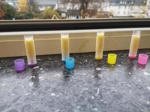 Viel Freude bereitete vor allem die Herstellung eigener Knetbälle aus Luftballons. Ein weiteres Highlight war der selbst hergestellte Lippenpflegestift. Hier mussten die Viertklässler genau abwiegen, stark erhitzen und lange rühren, bis die Pflegestifte als Schutz gegen trockene Lippen genutzt werden konnten. Bei der Station „Geheimschrift“ stieg die Spannung: Mit Zitronensaft schrieben die Kinder geheime Botschaften, die erst durch das Bügeleisen wieder sichtbar gemacht wurden. Bei dem Experiment zum „Farbenwunder Rotkohlsaft“ zeigten die Rivianer den Grundschülern den Umgang mit Reagenzgläsern und Pipetten. Hier staunten einige nicht schlecht, dass Rotkohlsaft als Indikator wirken kann, der Seifenlösungen und saure Säfte unterschiedlich färbt. Neu war in diesem Jahr das Rechnen mit farbigem Licht aus dem Bereich das Optik, was bei den Viertklässlern einiges Erstaunen hervorrief.