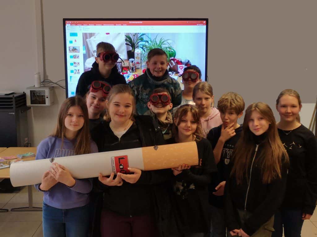 Foto: Die Schülerinnen und Schüler der 7b untersuchen die Riesenzigarette.